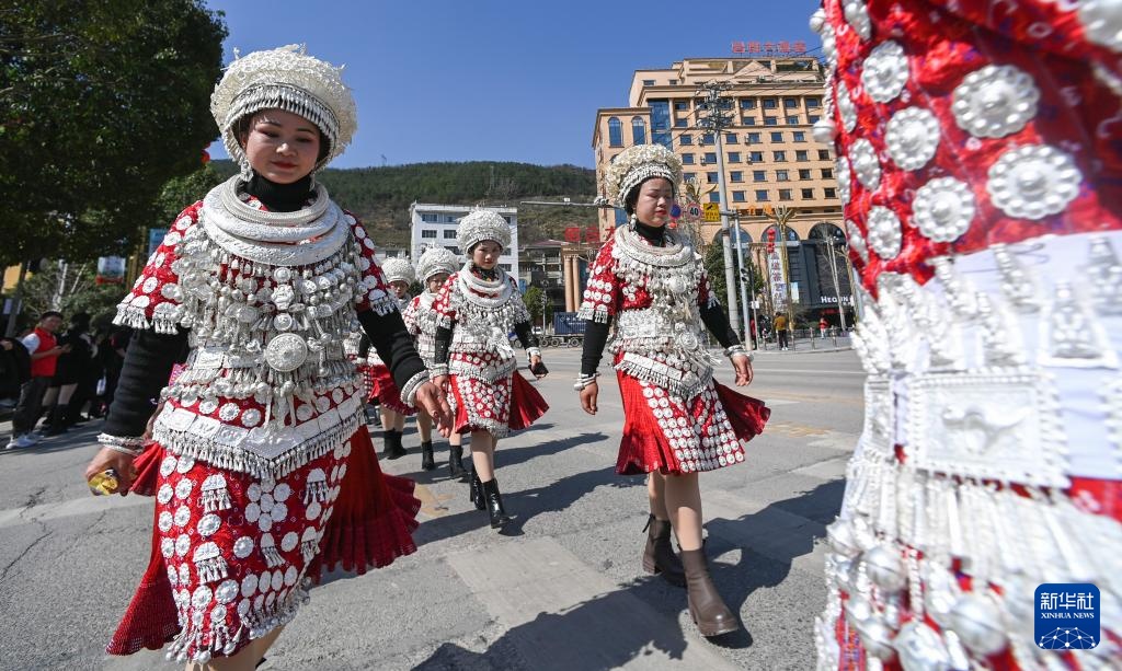 盛裝的苗族群眾參加貴州省黃平縣在農歷正月期間舉行的巡游活動(2月18日攝)。