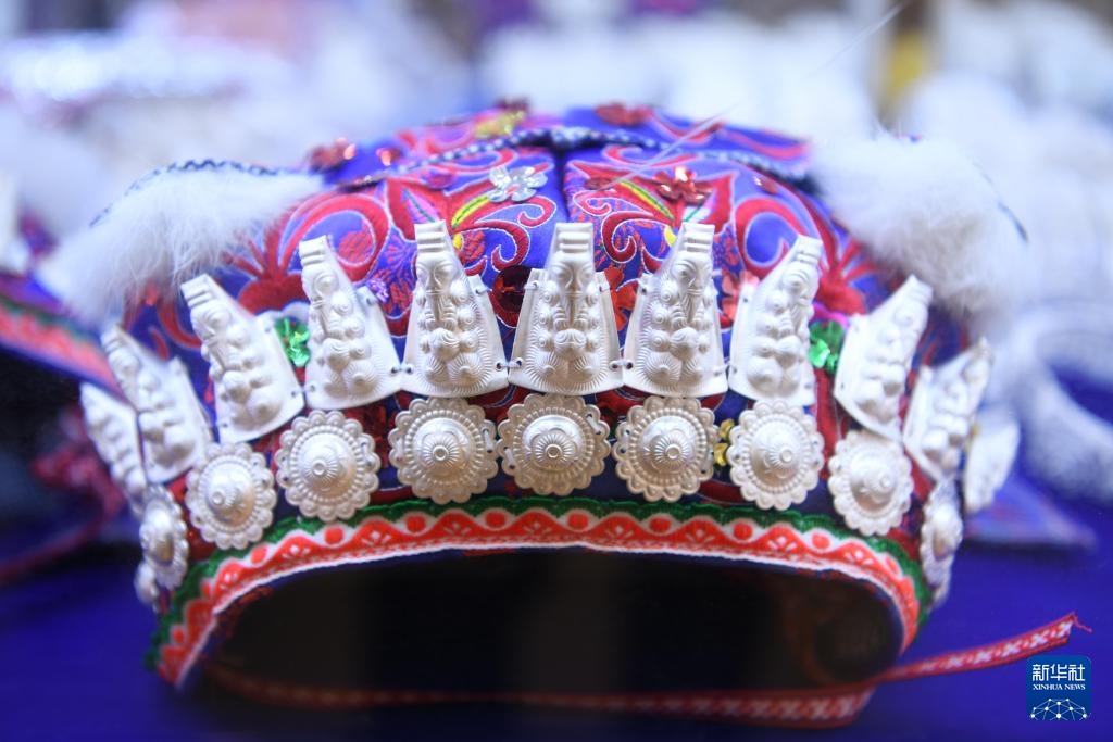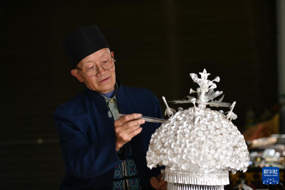 4月8日,在貴州省黃平縣,國家級非遺項目苗族銀飾制作技藝的代表性傳承人楊正貴在自己的工作室中整理一件銀帽。