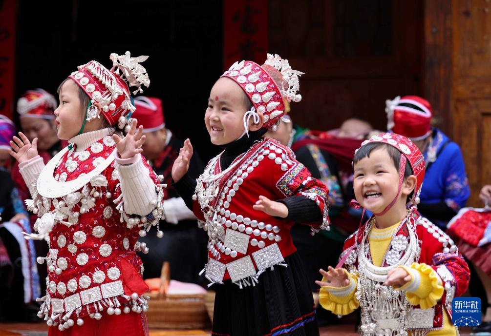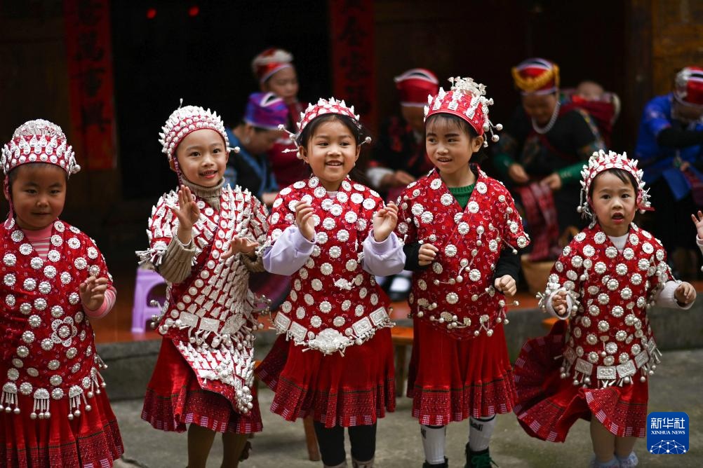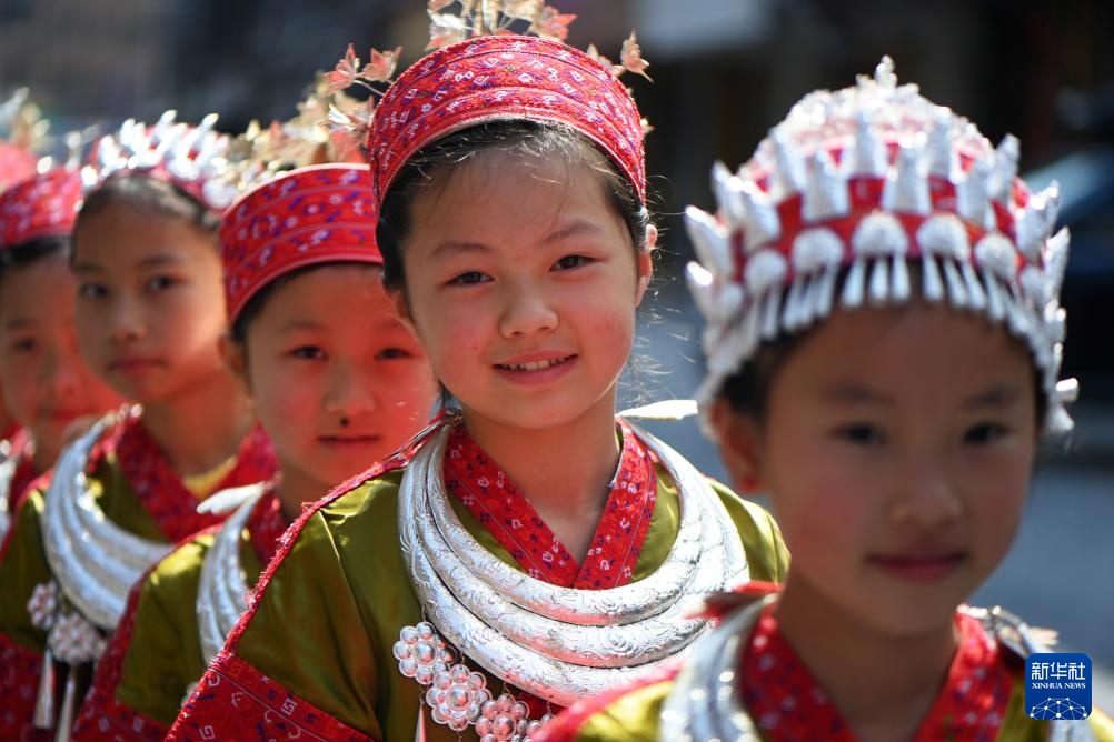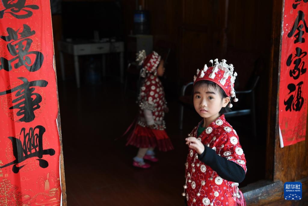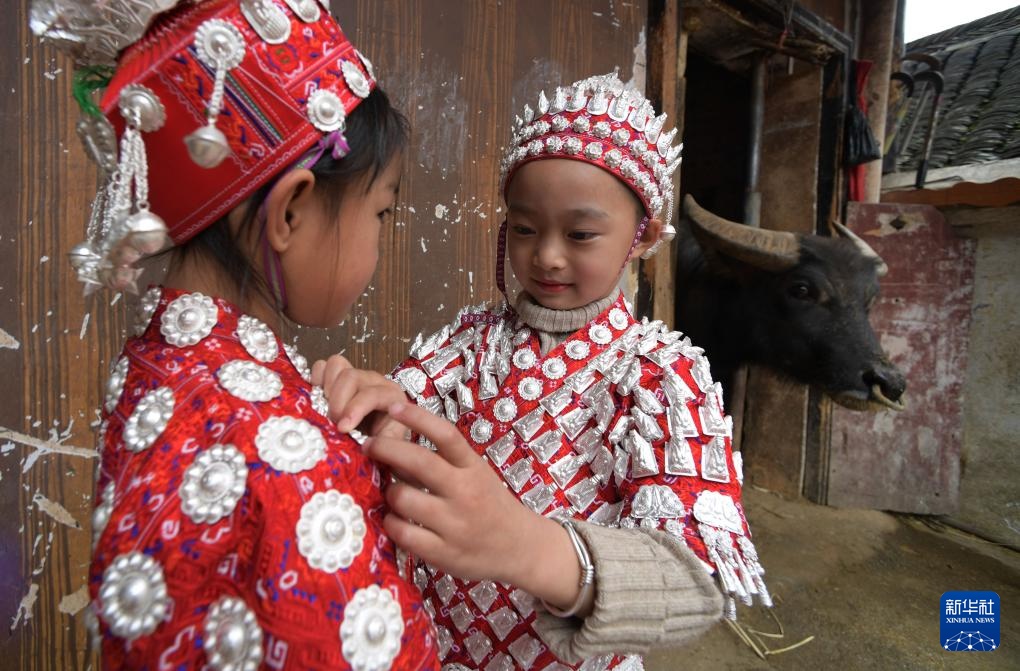 4月8日,穿著苗族盛裝的小朋友在貴州省黃平縣谷隴鎮大寨村玩耍。
