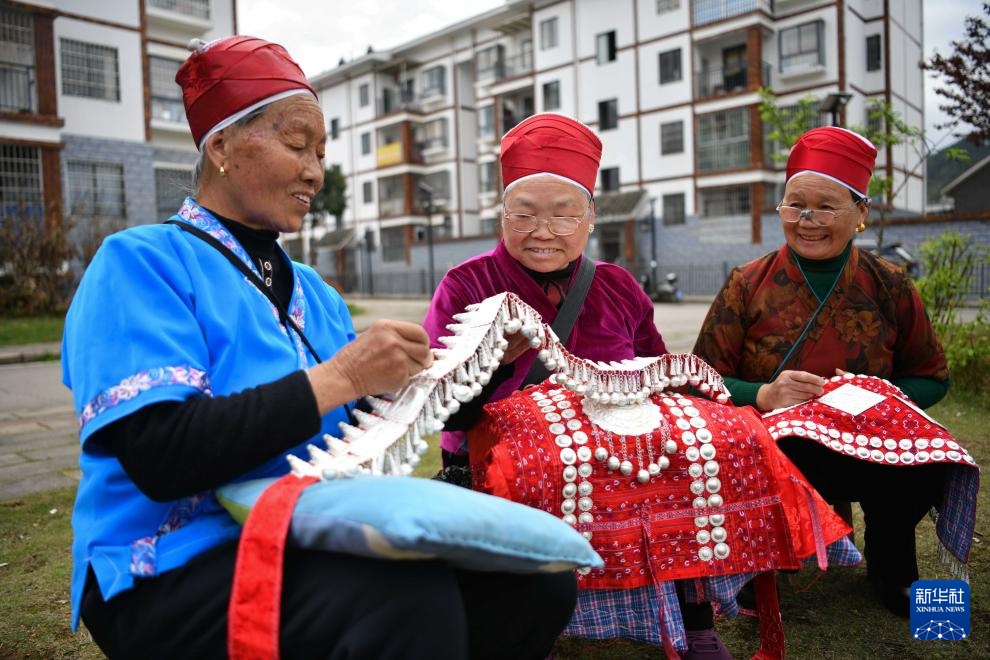 4月8日,苗族婦女在貴州省黔東南苗族侗族自治州黃平縣谷隴鎮苗嶺社區繡銀片。