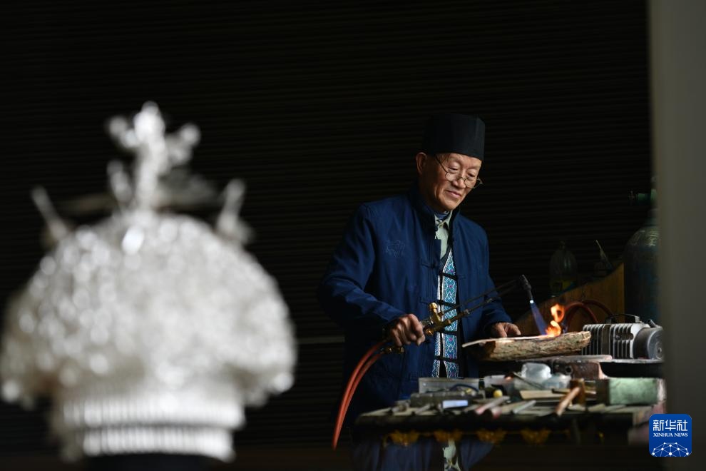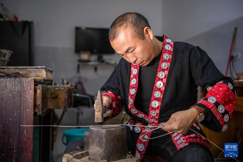 4月8日,在貴州省黃平縣,國家級非遺項目苗族銀飾制作技藝的代表性傳承人楊正貴在自己的工作室中加工銀飾。