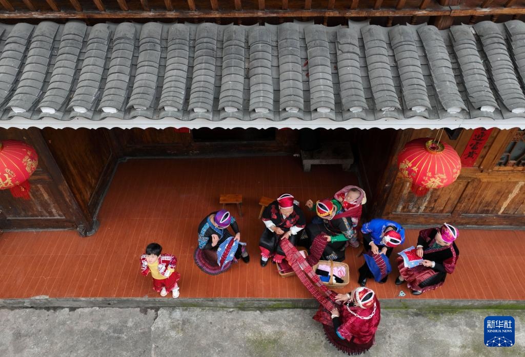 4月8日,苗族婦女在貴州省黃平縣谷隴鎮大寨村手工繡銀片(無人機照片)。