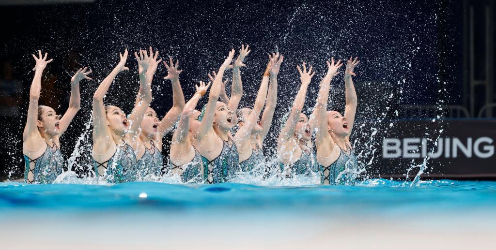 4月6日,在2024年花樣游泳世界杯(北京站)集體自由自選比賽中,中國隊以343.3479分的成績獲得冠軍。新華社記者 王麗莉 攝