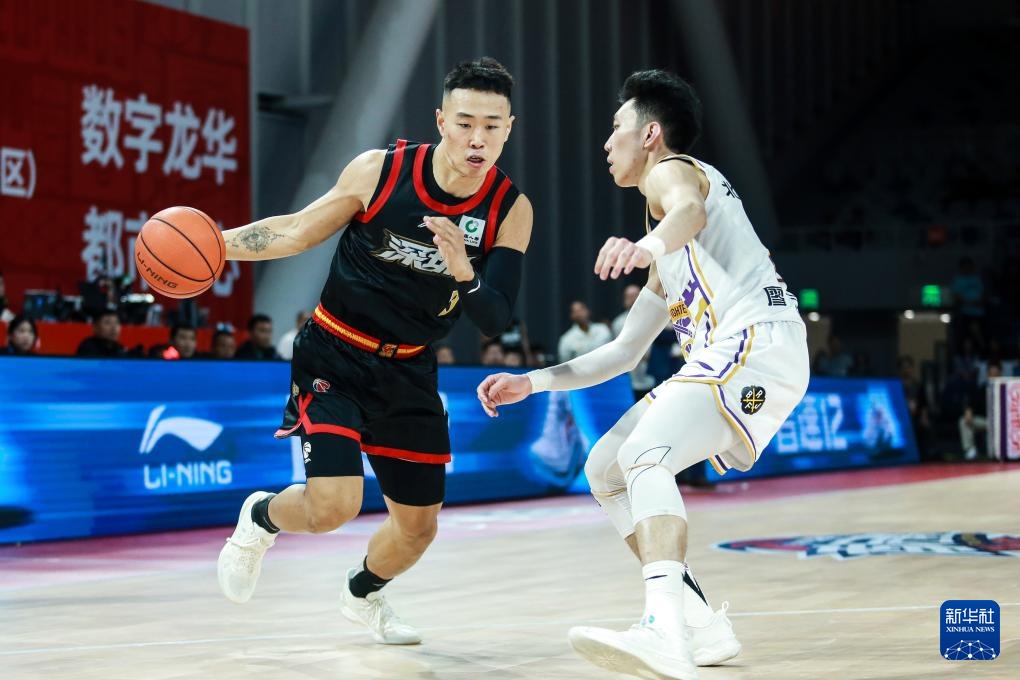 4月10日,北京控股隊球員鄒雨宸(前左)在比賽中持球進攻。新華社發(彭志剛攝)