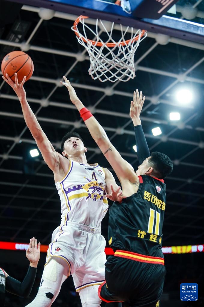 4月10日,北京控股隊球員王少杰(左)在比賽中上籃。新華社發(彭志剛攝)