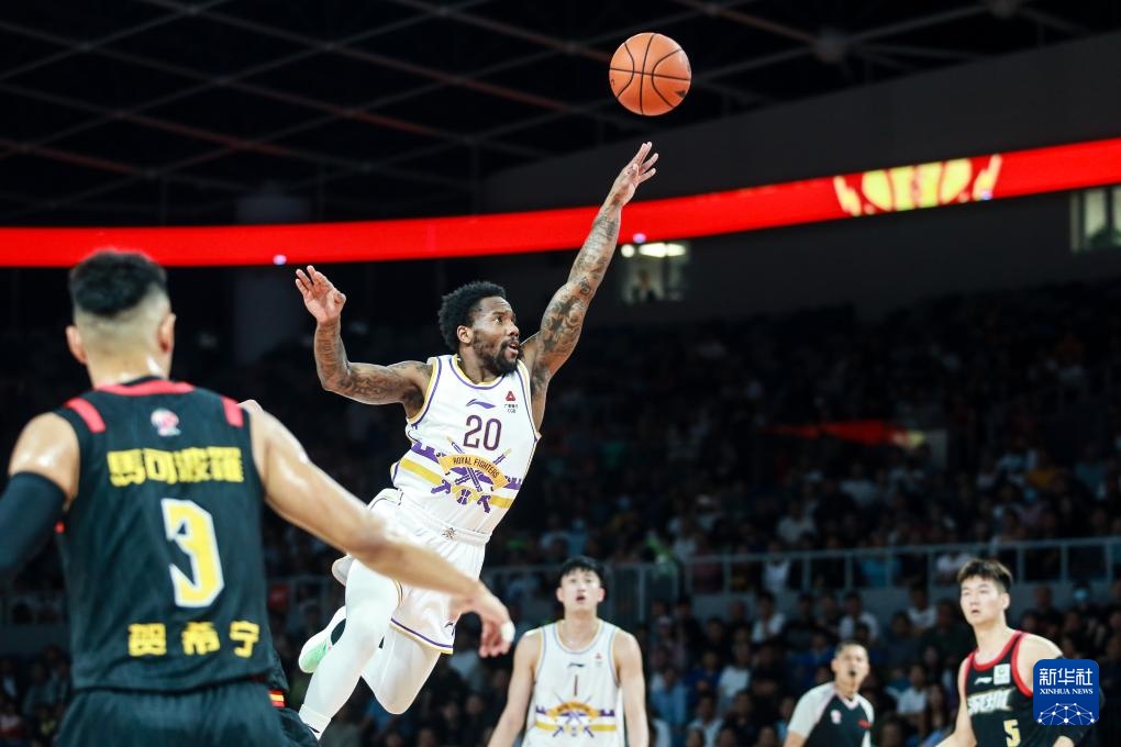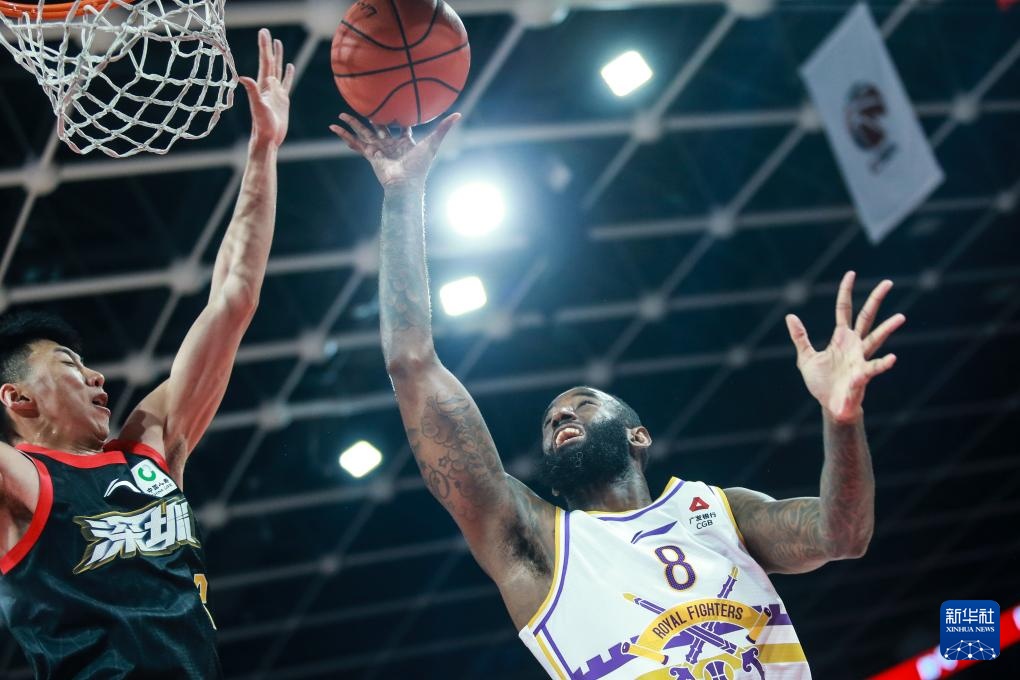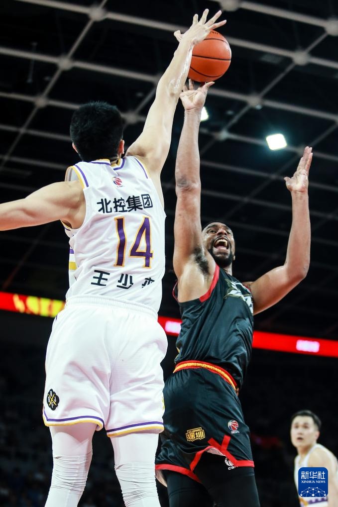 4月10日,深圳馬可波羅隊球員薩林杰(前右)在比賽中投籃。新華社發(彭志剛攝)
