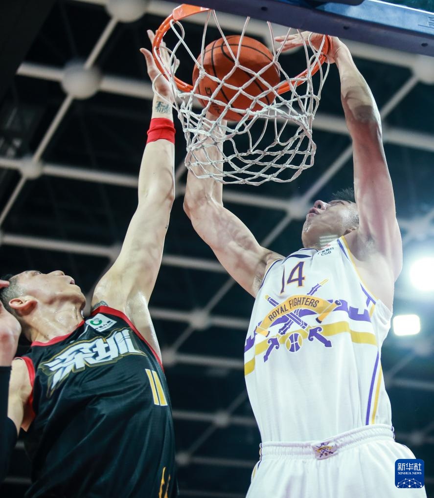 4月10日,北京控股隊球員王少杰(右)在比賽中扣籃。新華社發(彭志剛攝)