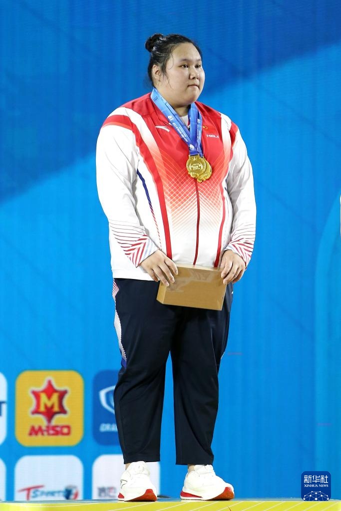 4月10日,冠軍中國選手李雯雯在頒獎儀式上。她以抓舉145公斤、挺舉180公斤、總成績325公斤收獲三枚金牌。新華社記者 王騰 攝
