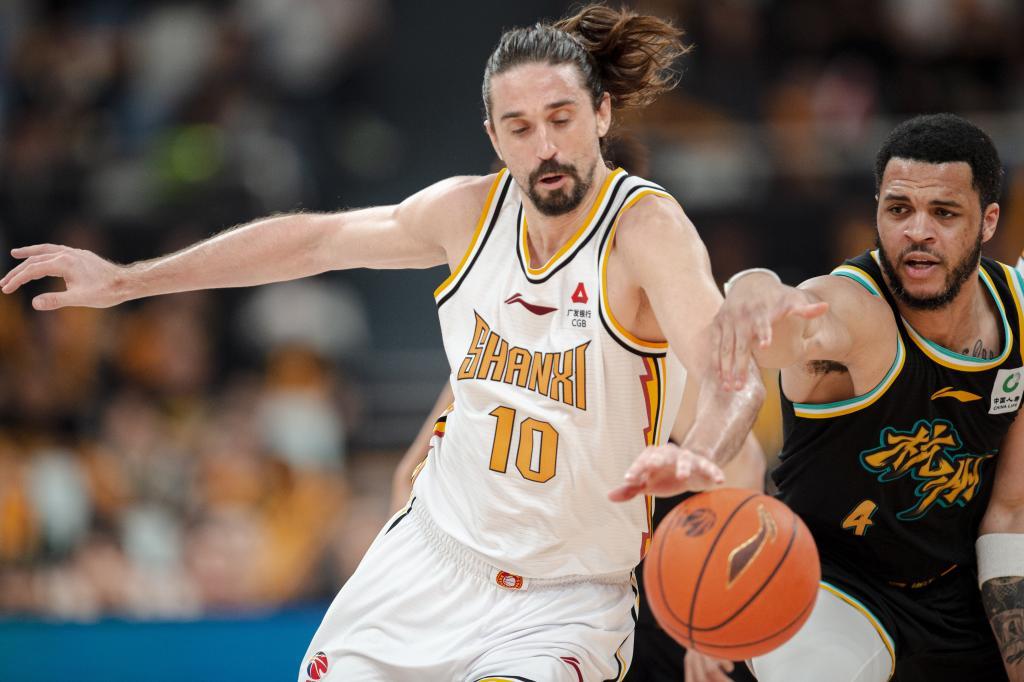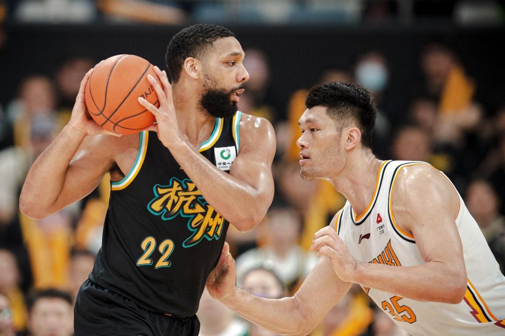 4月10日,廣廈隊球員韋瑟斯龐(右)防守山西隊球員施韋德。新華社記者 江漢 攝