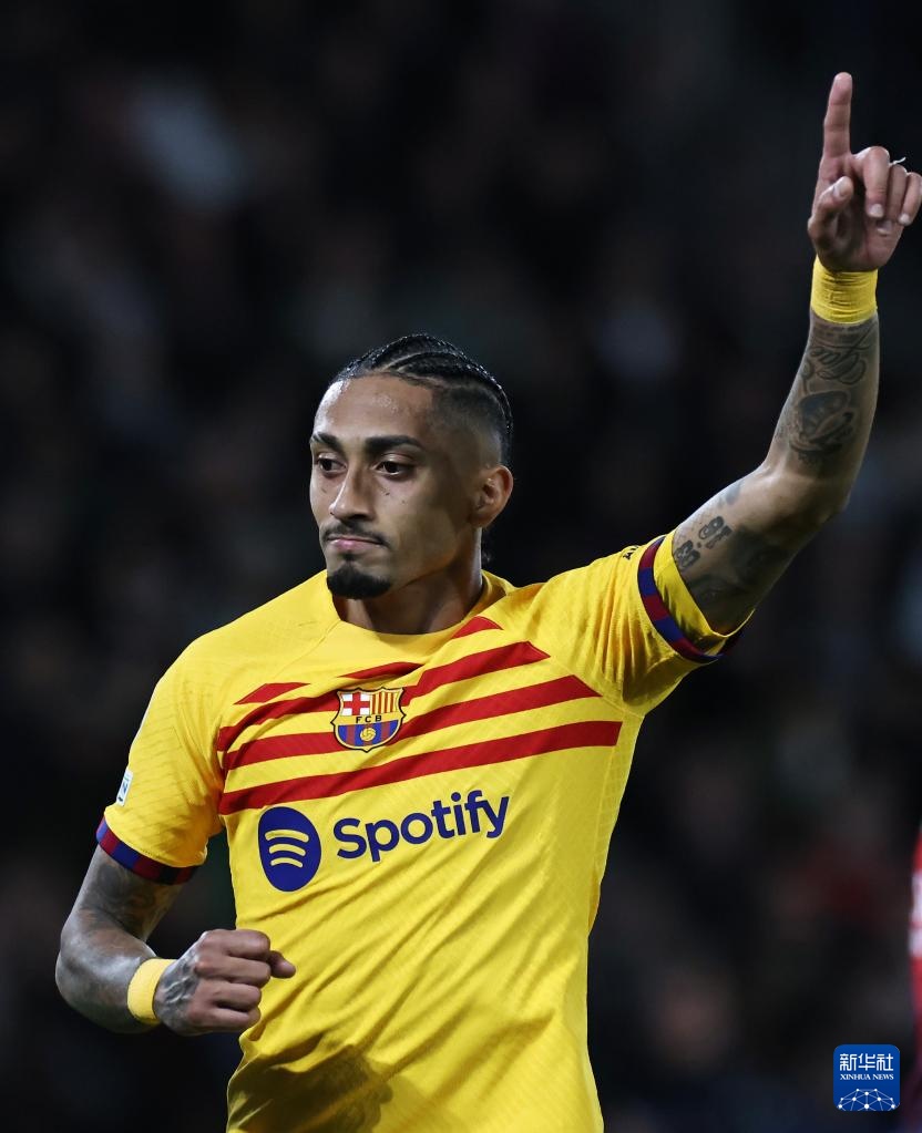 4月10日,巴塞羅那隊球員拉菲尼亞在比賽中慶祝進球。新華社記者 高靜 攝