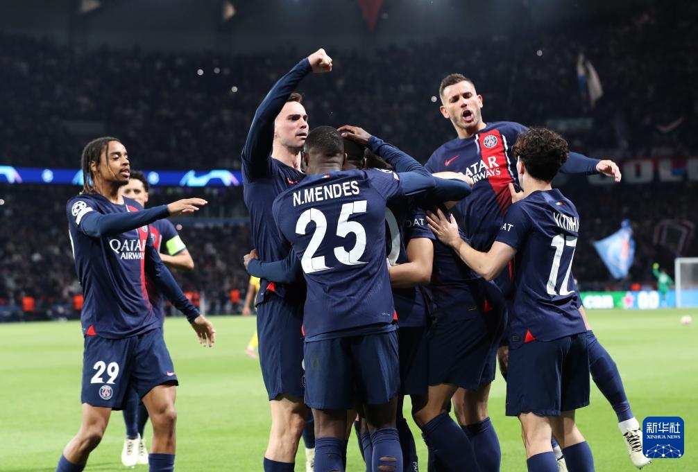 4月10日,巴黎圣日耳曼隊球員慶祝進球。新華社記者 高靜 攝