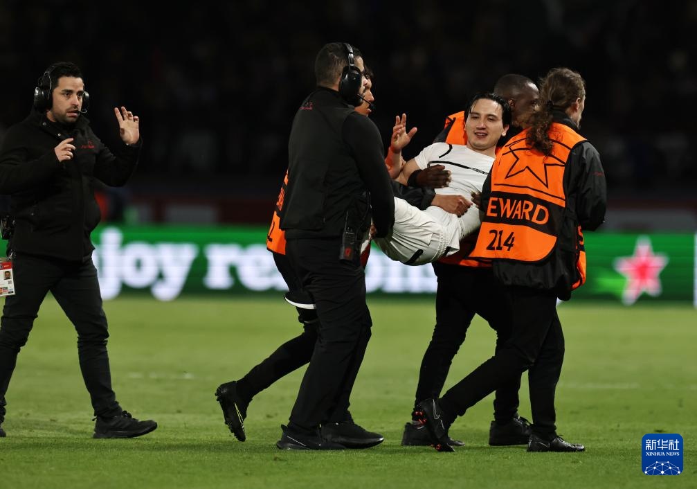 4月10日,工作人員將闖入場內的球迷抬出。新華社記者 高靜 攝