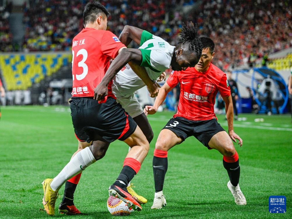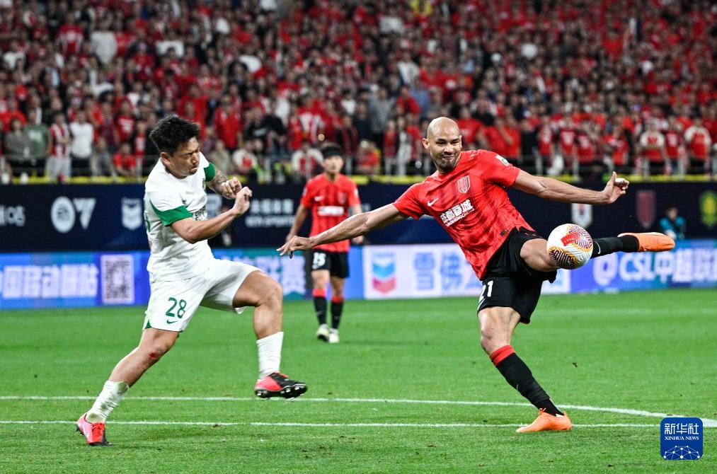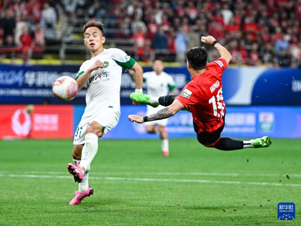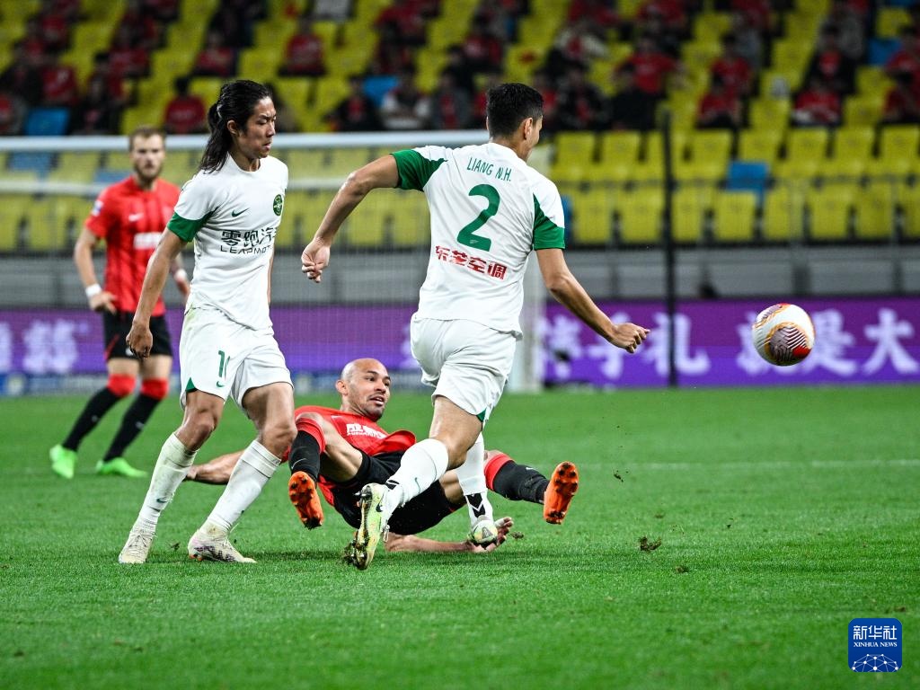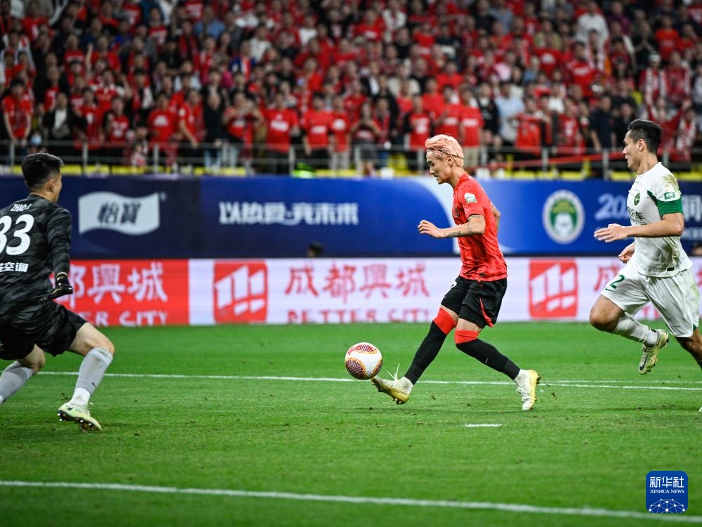 4月10日,成都蓉城隊球員費利佩(右)在比賽中射門。新華社記者 王曦 攝
