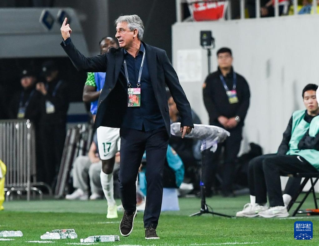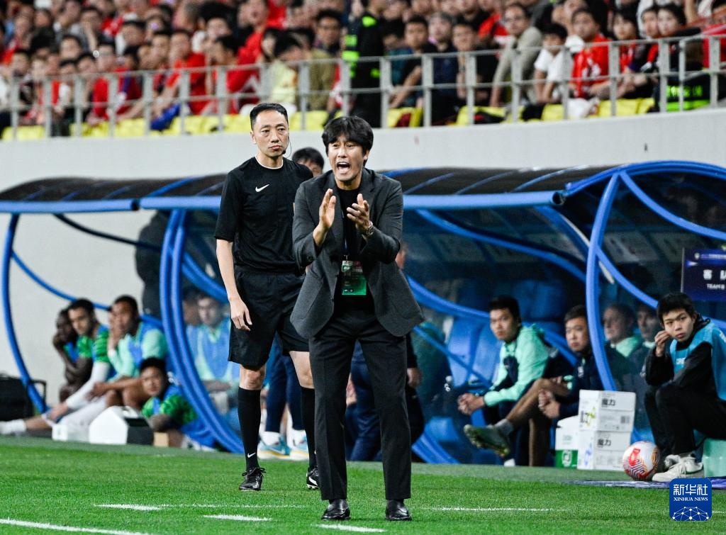 4月10日,成都蓉城隊球員主教練徐正源(右)在比賽中鼓勵球員。新華社記者 王曦 攝