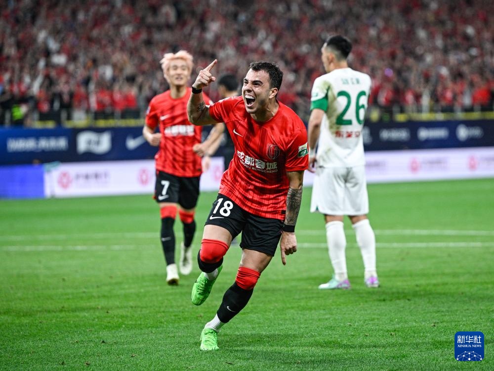 4月10日,成都蓉城隊球員安德里戈(前)慶祝進球。新華社記者 王曦 攝