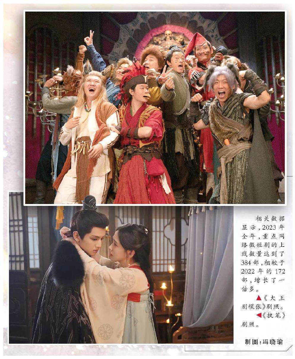 相關數據顯示,2023年全年,重點網絡微短劇的上線數量達到了384部,相較于2022年的172部,增長了一倍多。《大王別慌張》劇照。《執筆》劇照。制圖:馮曉瑜