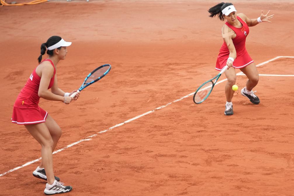 4月11日,中國隊組合郭涵煜(右)/王欣瑜在雙打比賽中。她們2:1戰勝新西蘭隊組合盧特利芙/孫璐璐。新華社記者 薛宇舸 攝