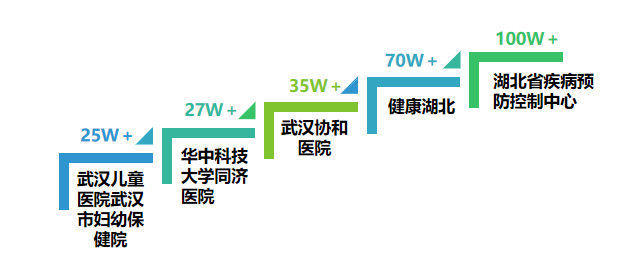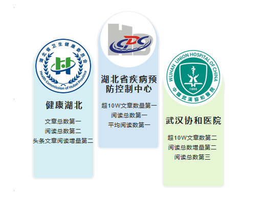 從文章閱讀總數來看,“湖北省疾病預防控制中心”成績亮眼,以100萬+遠超第二名,穩居第一;“健康湖北”以70萬+閱讀量排名第二;“武漢協和醫院”以35萬+位列第三名,“華中科技大學同濟醫院”以27萬+緊隨其后排第四,“武漢兒童醫院武漢市婦幼保健院”以25萬+閱讀量排第五名。