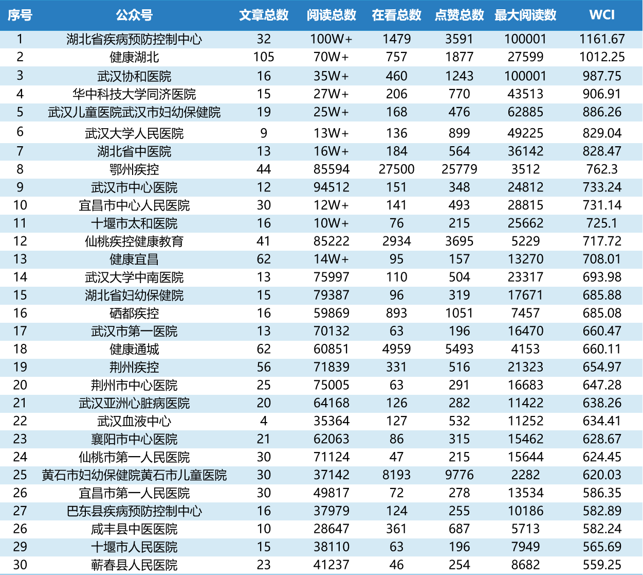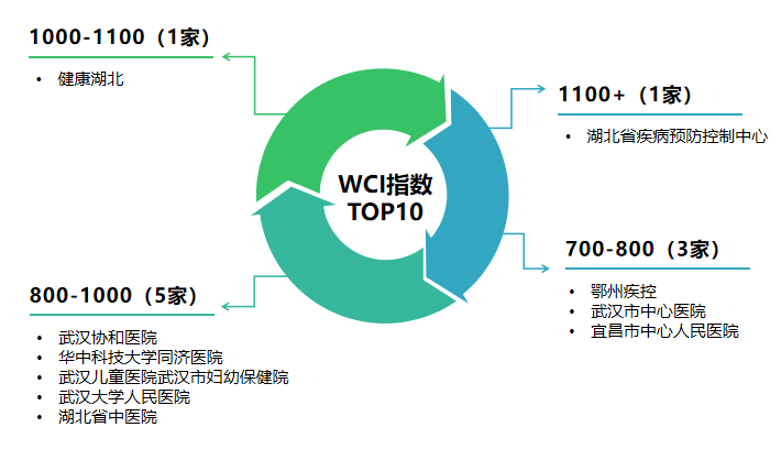 從WCI指數來看,前十名賬號WCI值整體較之前變動較小,WCI值超過1100的賬號有1家,是“湖北省疾病預防控制中心”;1000-1100指數區間的有1家,為“健康湖北”;800-1000指數區間的有5家,分別是“武漢協和醫院”“華中科技大學同濟醫院”“武漢兒童醫院武漢市婦幼保健院”“武漢大學人民醫院”“湖北省中醫院”;700-800指數區間有3家,分別為“鄂州疾控”“武漢市中心醫院”“宜昌市中心人民醫院”。