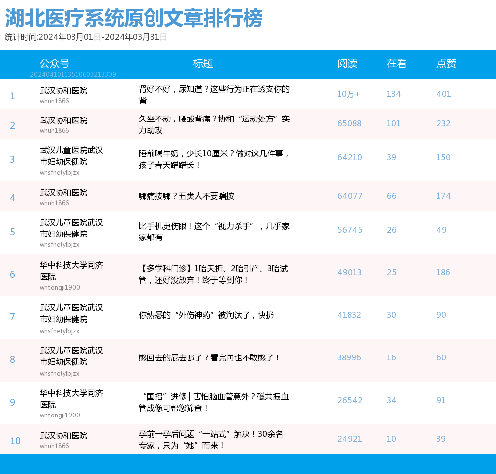 3月,原創文章TOP10的推文共來自3家醫院微信公眾號。“武漢兒童醫院武漢市婦幼保健院”與“武漢協和醫院”各攜4篇文章入榜;“華中科技大學同濟醫院”攜2篇文章入榜。