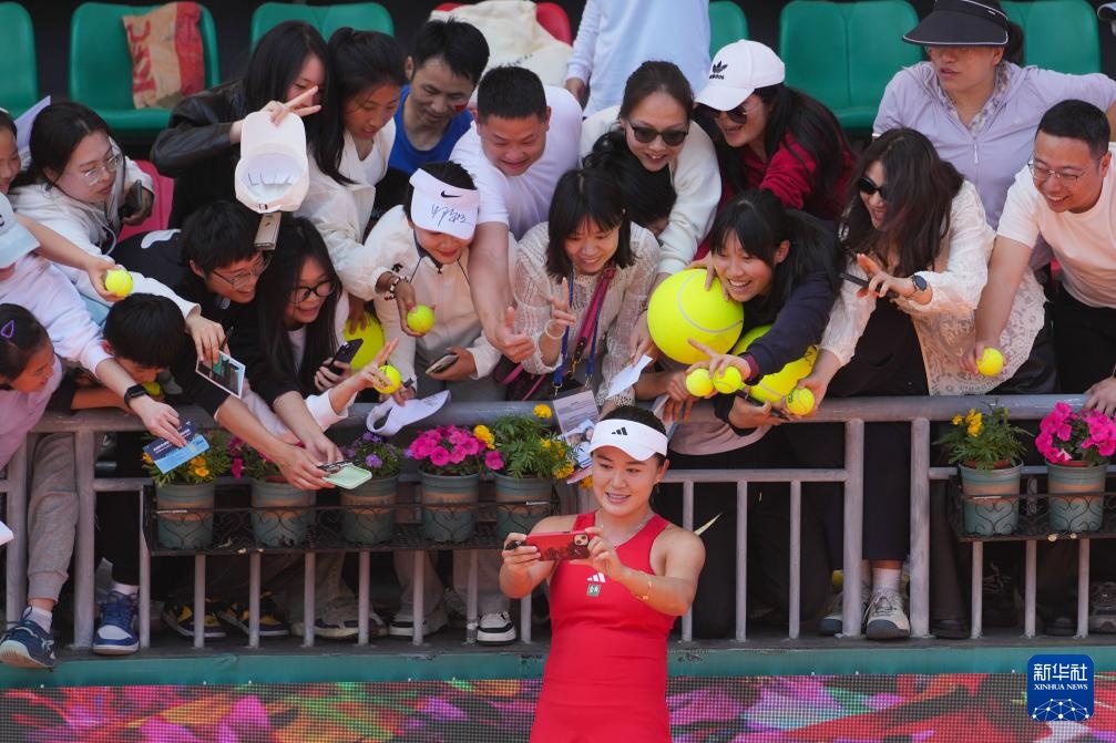 4月12日,中國隊選手朱琳(下)在單打比賽后與觀眾合影。她2比0戰勝太平洋大洋洲聯隊選手舒斯特。新華社記者 薛宇舸 攝