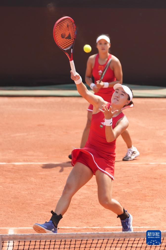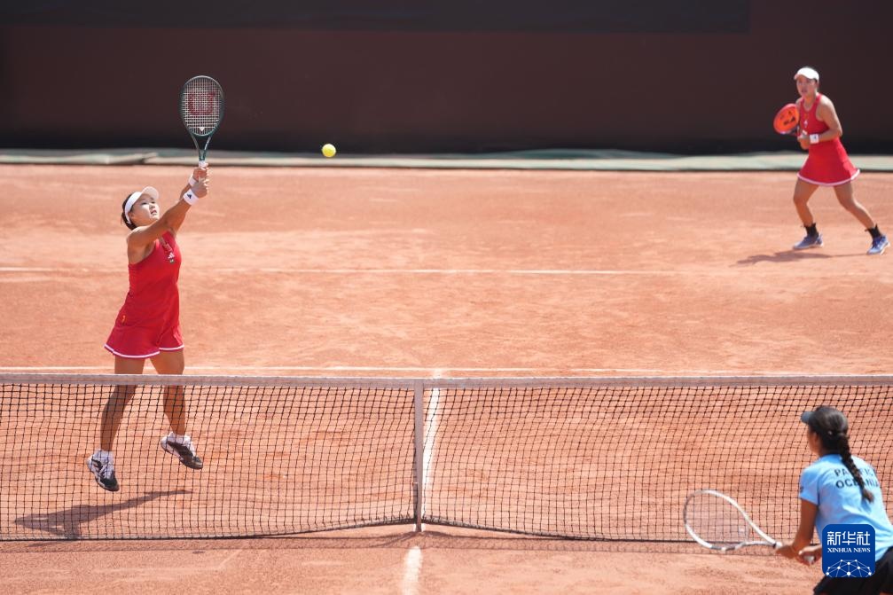 4月12日,中國隊組合郭涵煜/朱琳(前)在雙打比賽中回球。她們2比0戰勝太平洋大洋洲聯隊組合布西/舒斯特。新華社記者 薛宇舸 攝