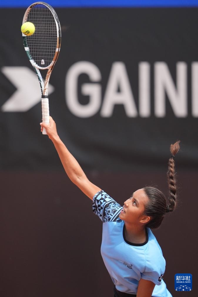 4月12日,中國隊選手郭涵煜在單打比賽中發球。她2比0戰勝太平洋大洋洲聯隊選手布西。新華社記者 薛宇舸 攝
