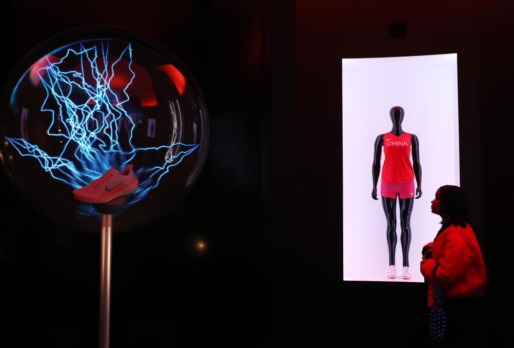 4月11日,一名參觀者在中國女子田徑奧運比賽裝備前駐足。新華社記者 高靜 攝