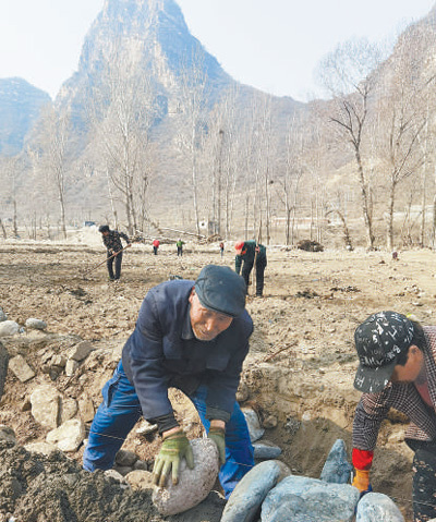 離開(kāi)上莊村,沿河來(lái)到龍門(mén)鄉(xiāng)龍門(mén)村,一些村民在村口山坡上修復(fù)土地。村民王定國(guó)有1畝多地,在坡上分成3片,最小的一片只能站下3個(gè)人,地邊石堰被沖出兩個(gè)豁口,他把散落的石頭撿回去砌好。“堵上豁口,就能保住這3片地,趕在4月底種玉米。”全村已修復(fù)80多畝土地,村民備好了玉米種子,“大伙兒憋著一股勁,把去年的收成扳回來(lái)。”