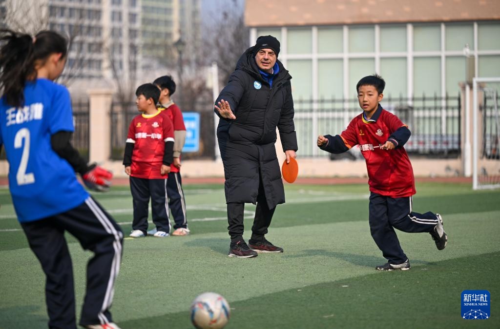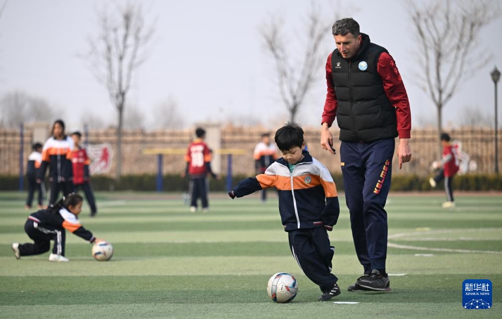 塞爾維亞籍足球教練亞歷山大·潘蒂奇(右)在天津市靜海區華康街道第一小學指導小球員進行足球盤帶(3月6日攝)。新華社記者 孫凡越 攝