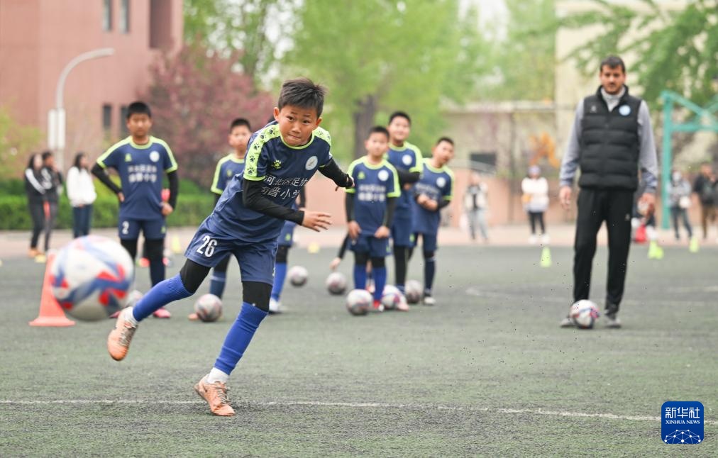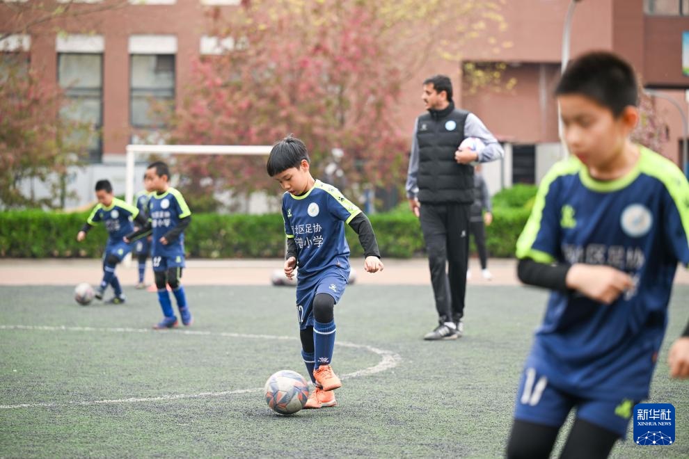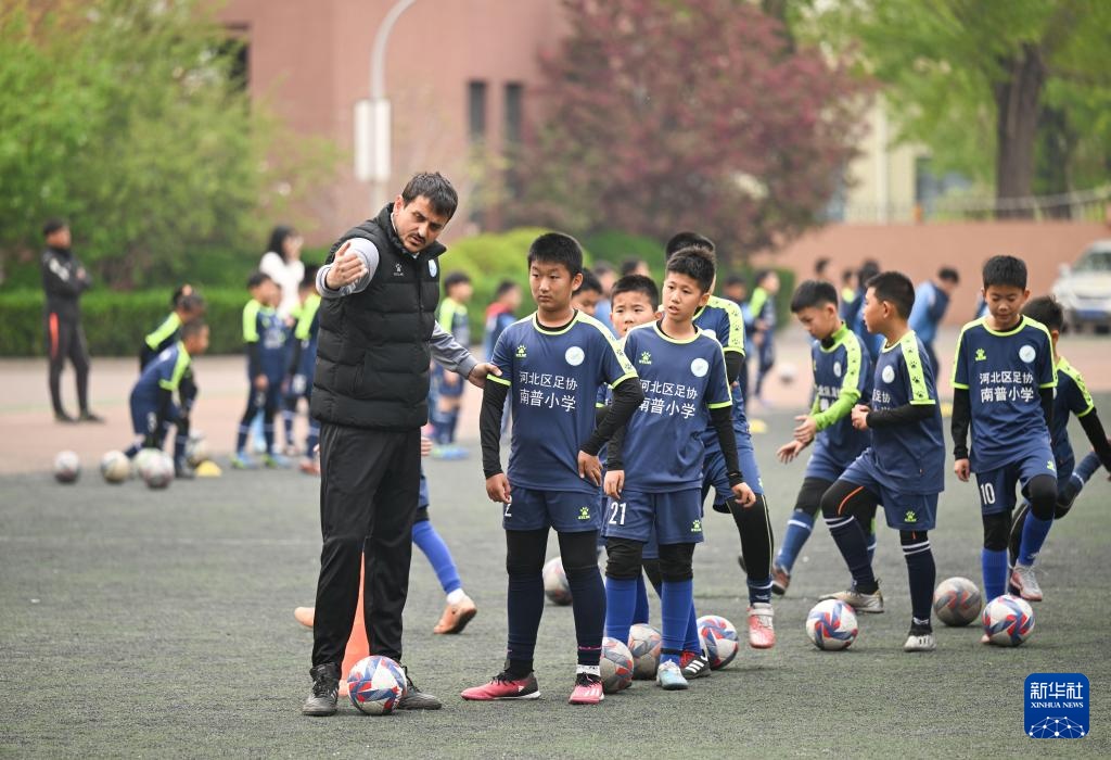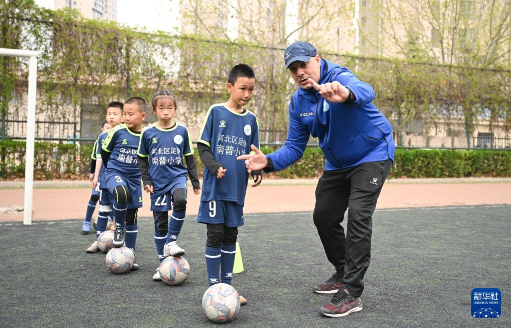在天津外國語學校南普小學,西班牙籍足球教練佩德羅·諾奎拉(右一)指導小球員訓練(4月10日攝)。新華社記者 孫凡越 攝