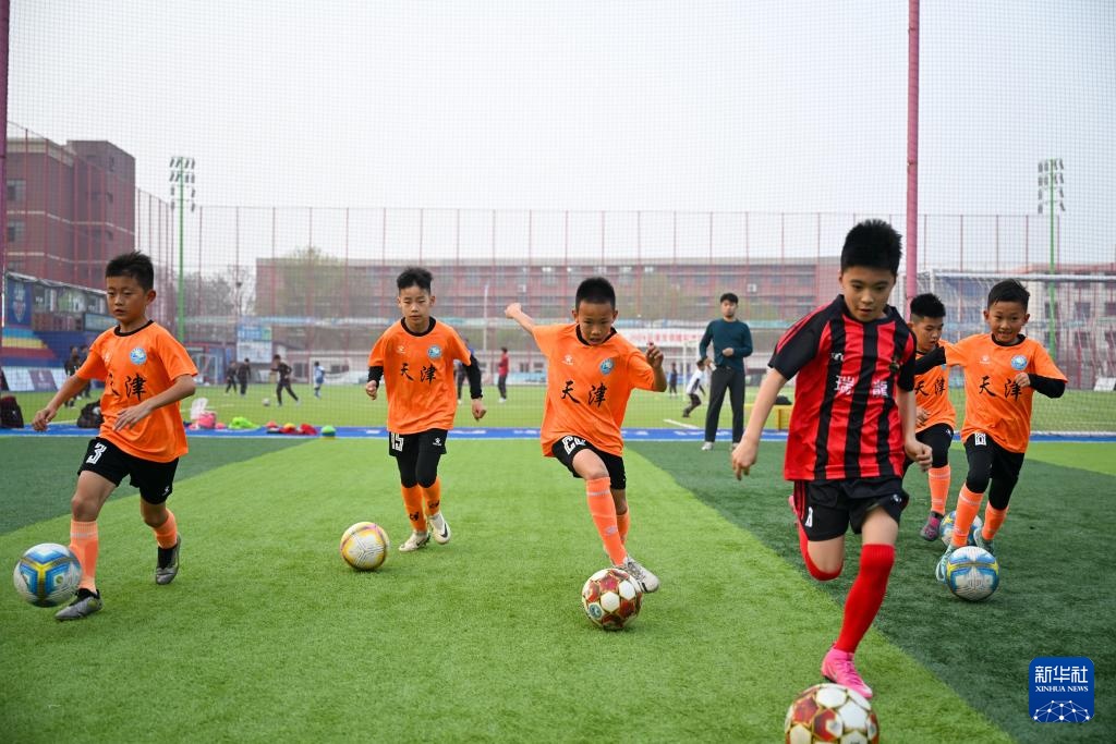在天津市足協青訓基地,天津市足協青訓中心的青少年球員進行訓練(4月11日攝)。新華社記者 孫凡越 攝