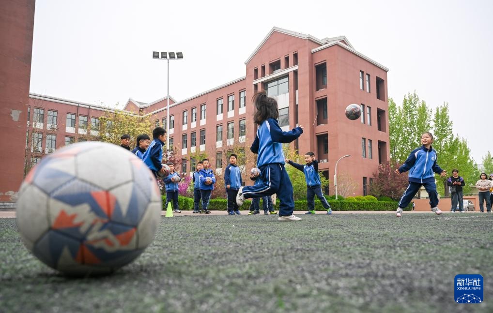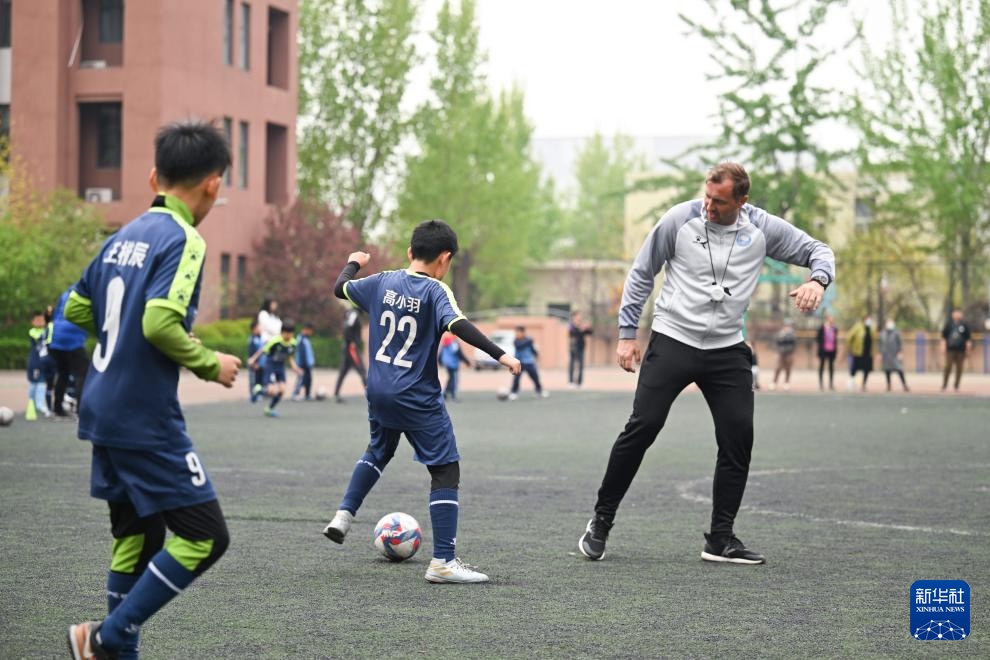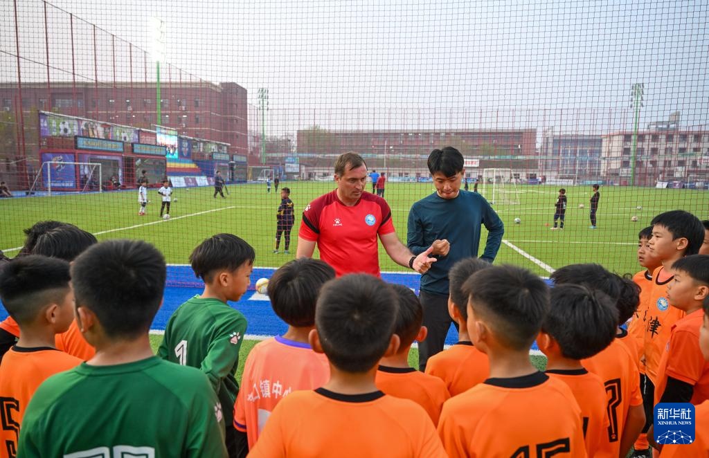 塞爾維亞籍足球教練阿倫·查卡拉(左)為天津外國語學校南普小學的小球員們講解射門技巧(4月10日攝)。新華社記者 孫凡越 攝