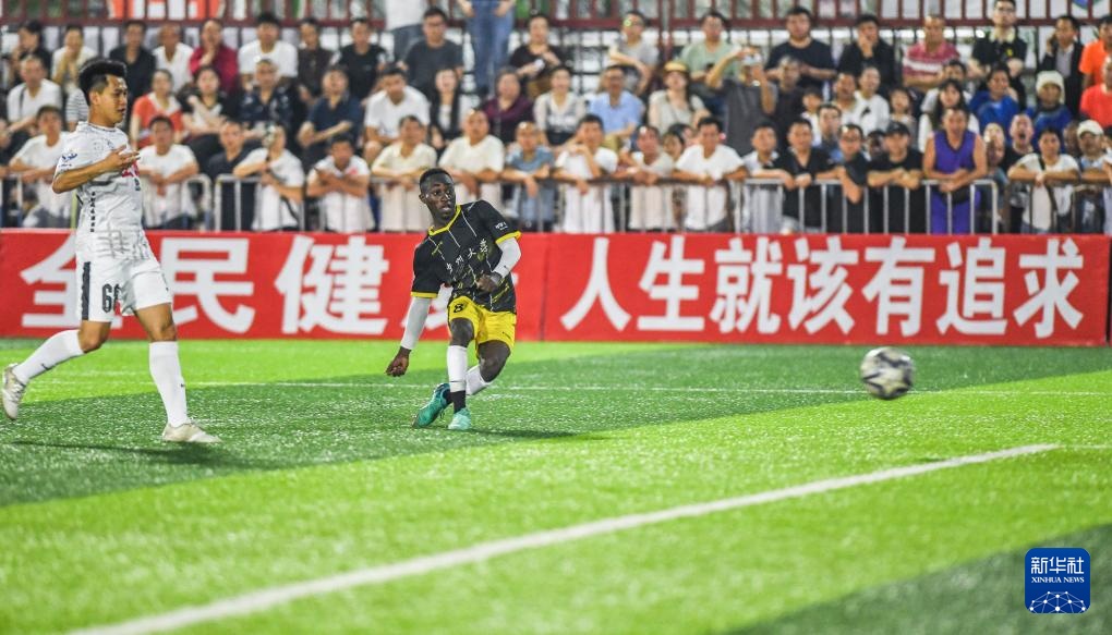 4月13日,貴州大學國際學生足球隊球員歐陸安比賽中進攻。新華社記者 陶亮 攝