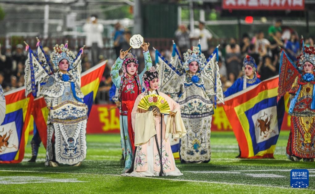 4月13日,上饒渣渣灰江西米粉足球隊的助威團在中場休息時進行表演。新華社記者 陶亮 攝