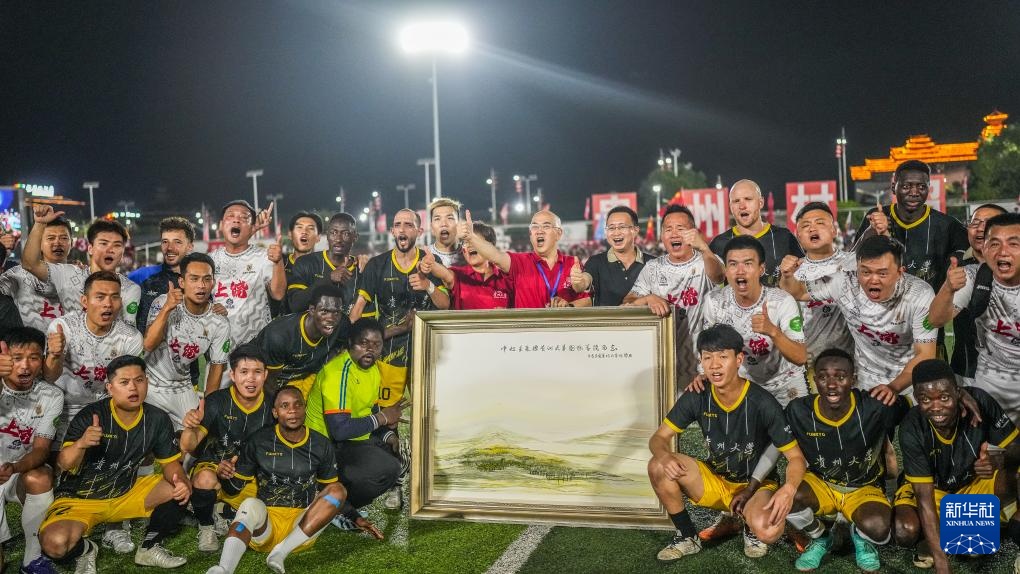 4月13日,貴州大學國際學生足球隊和上饒渣渣灰江西米粉足球隊成員在賽后合影留念。新華社記者 陶亮 攝