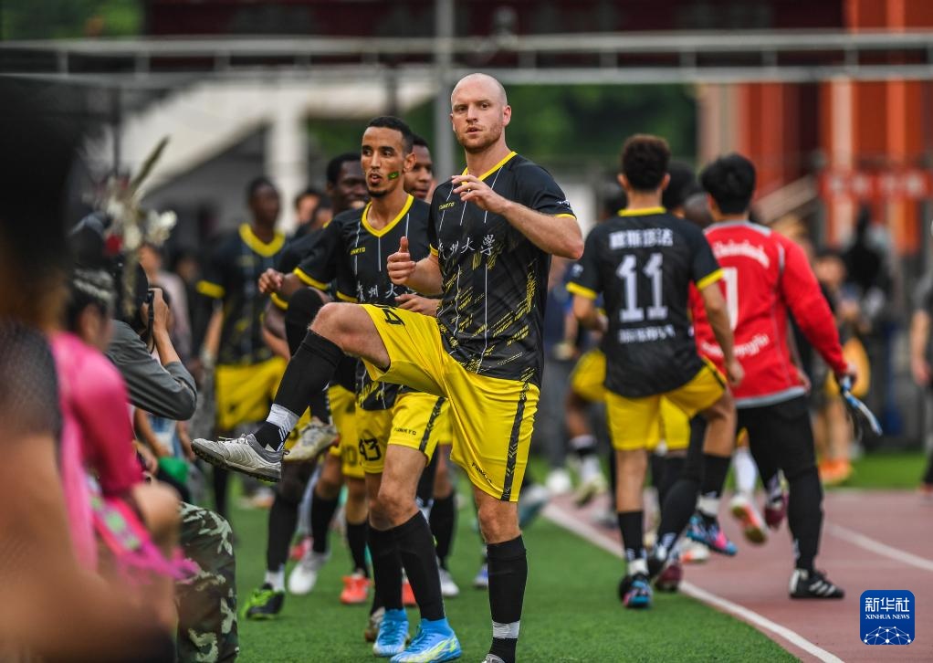 4月13日,貴州大學國際學生足球隊球員在賽前進行熱身。新華社記者 陶亮 攝