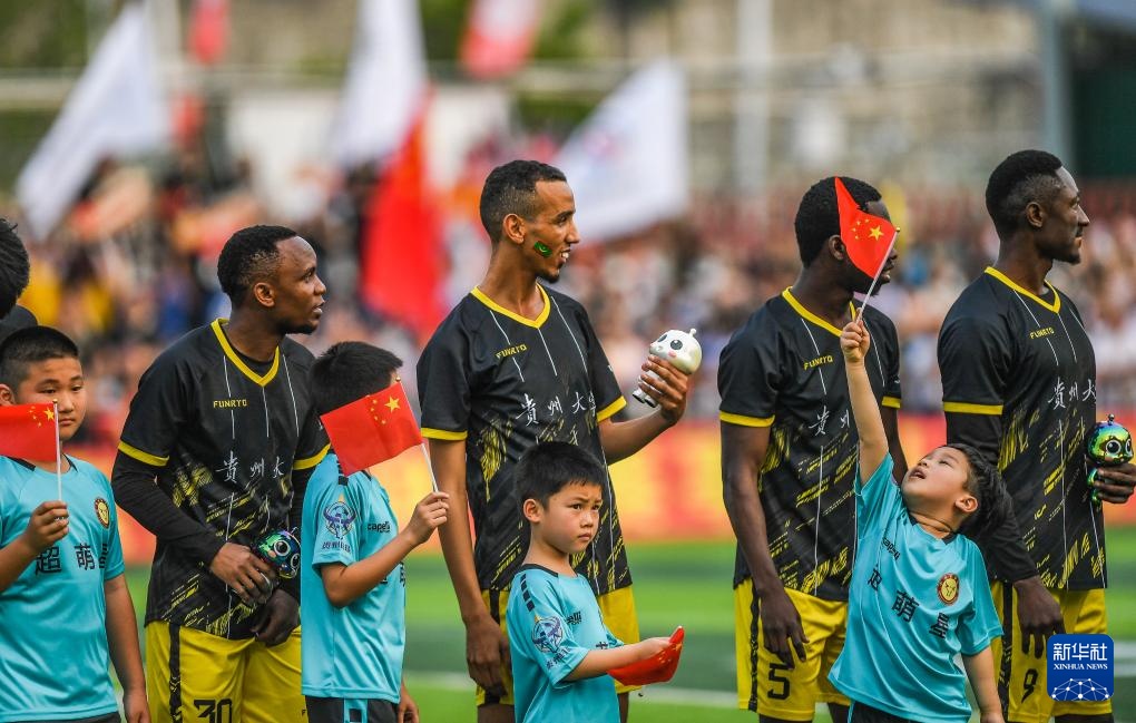 4月13日,貴州大學國際學生足球隊球員在賽前和球童一起上場。新華社記者 陶亮 攝
