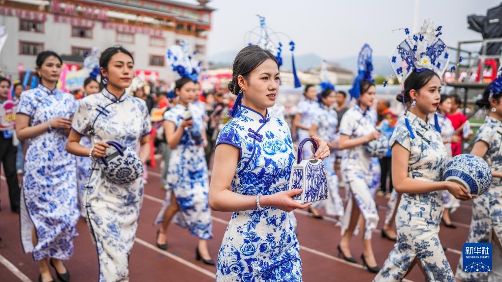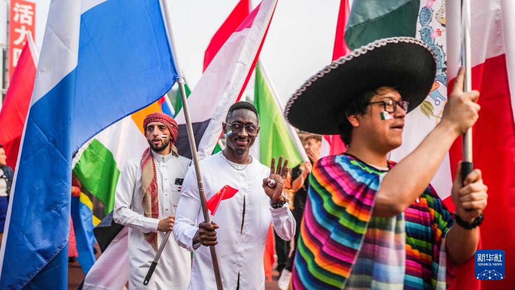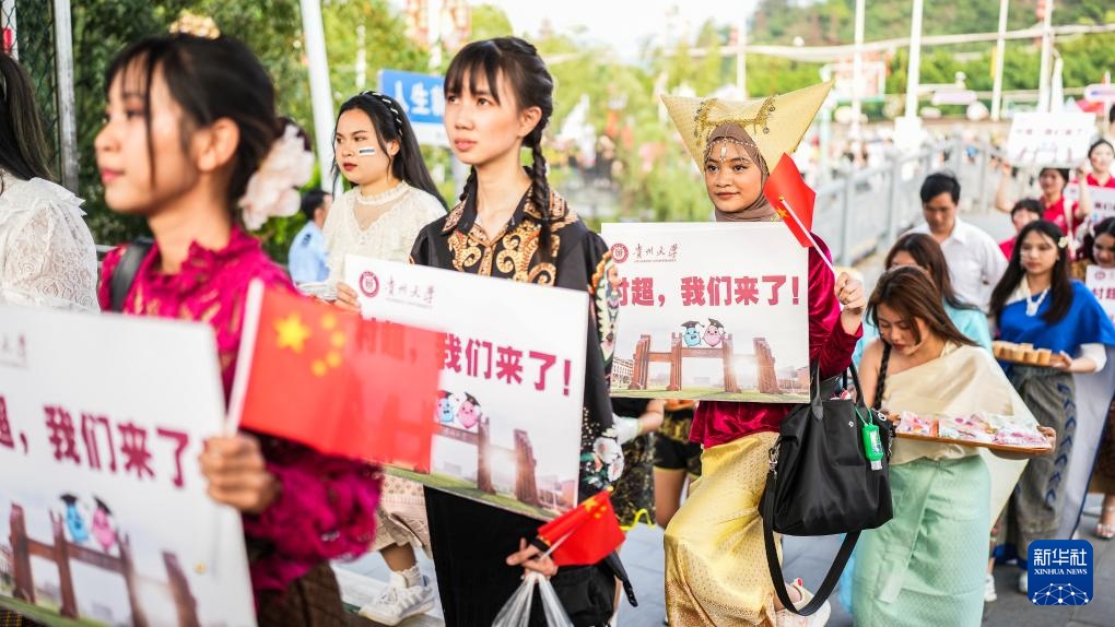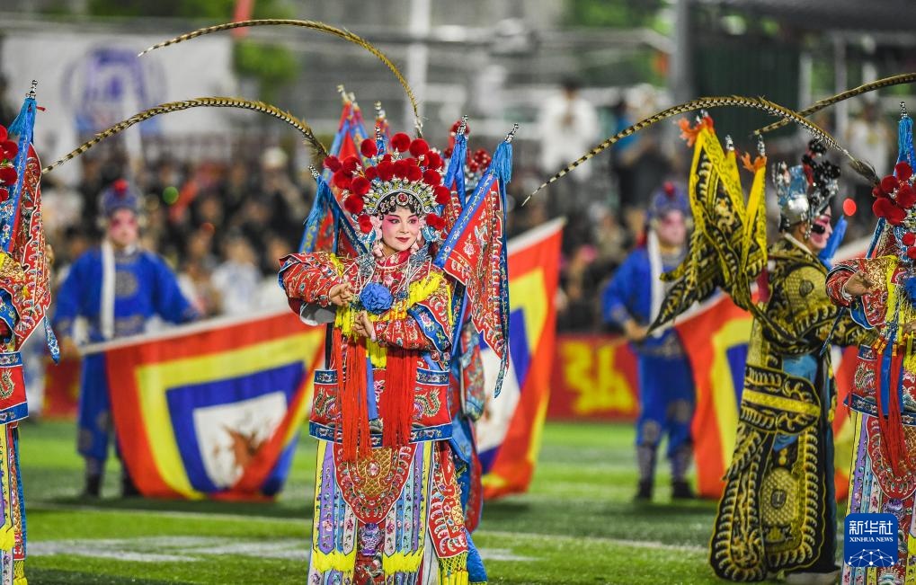 4月13日,貴州大學的留學生們在中場休息時進行歌舞表演并向觀眾示意。新華社記者 陶亮 攝