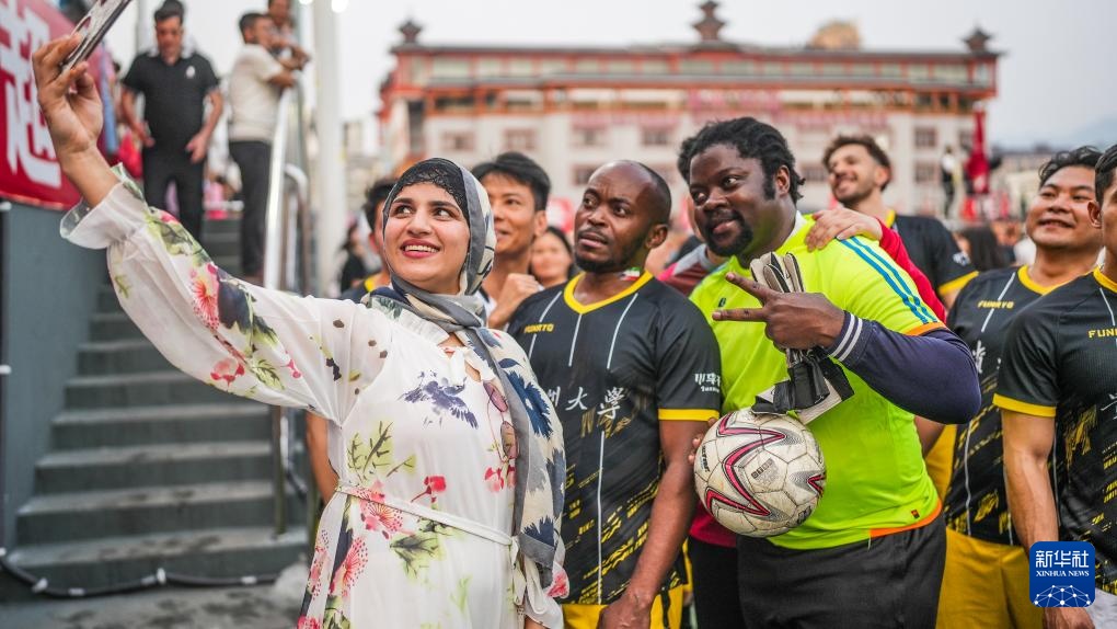 4月13日,一名女留學生和貴州大學國際學生足球隊球員自拍合影。新華社記者 陶亮 攝