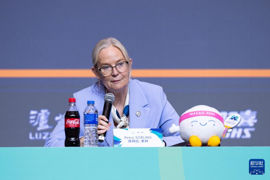 4月14日,國際乒聯主席、國際奧委會委員佩特拉·索林在新聞發布會上發言。新華社記者 張金加 攝