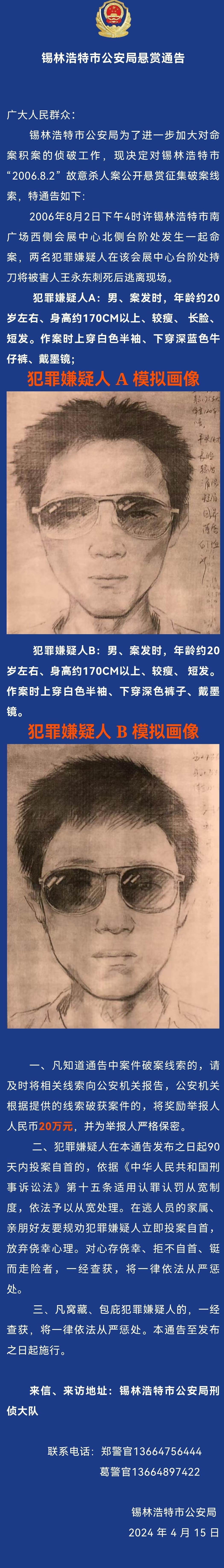 中新網4月15日電 據內蒙古錫林浩特市公安局官方微信消息,2006年8月2日下午4時許,錫林浩特市南廣場西側會展中心北側臺階處發生一起命案,兩名犯罪嫌疑人在該會展中心臺階處持刀將被害人王永東刺死后逃離現場。錫林浩特市公安局為了進一步加大對命案積案的偵破工作,現決定對錫林浩特市“2006.8.2”故意殺人案公開懸賞征集破案線索,特通告如下。