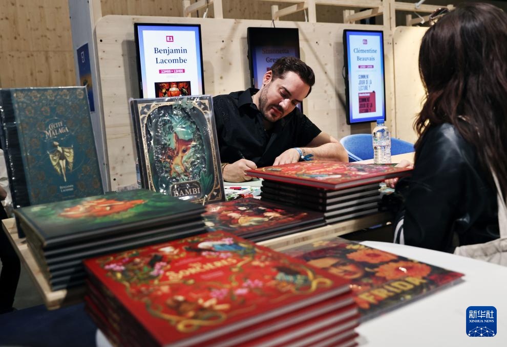 4月14日,在法國巴黎舉行的2024巴黎書展上,插畫家本杰明·拉孔為讀者簽售。