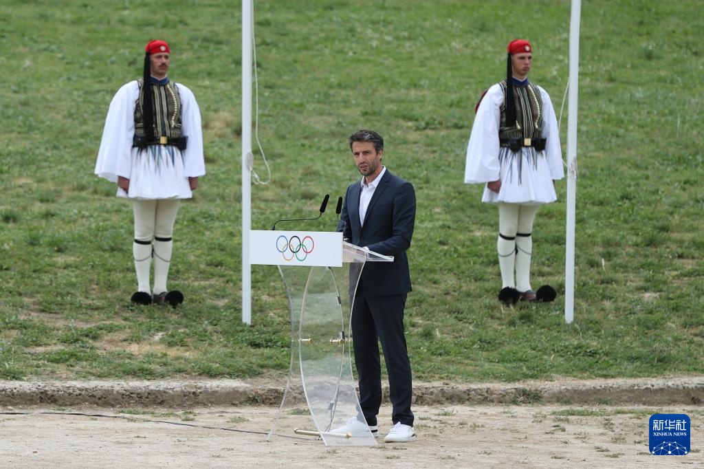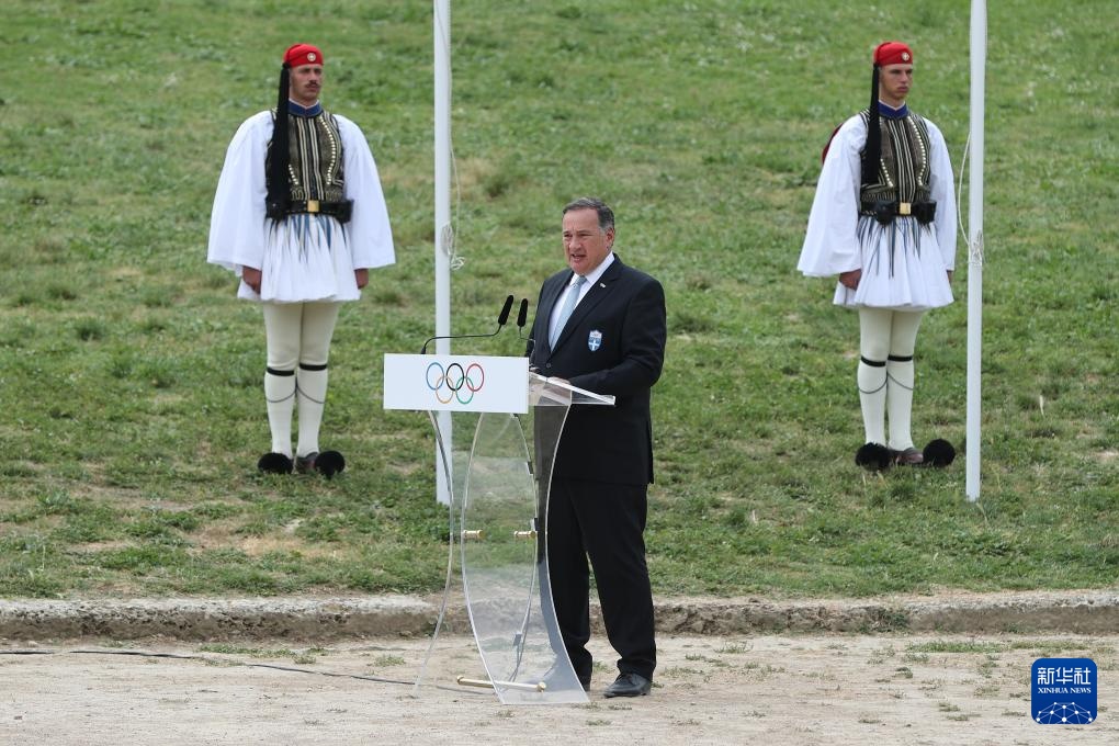 4月16日,希臘奧委會(huì)主席卡普拉洛斯在儀式上致辭。新華社記者 趙丁喆 攝