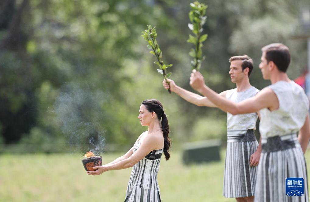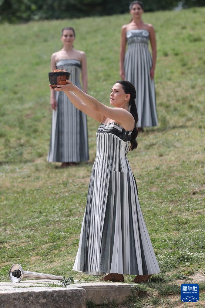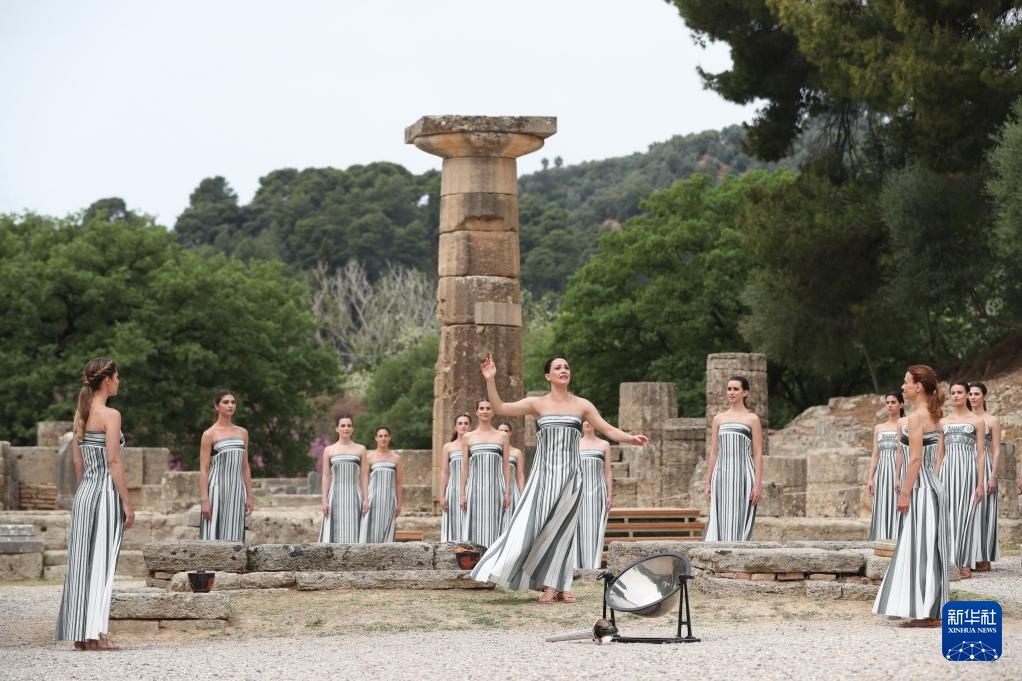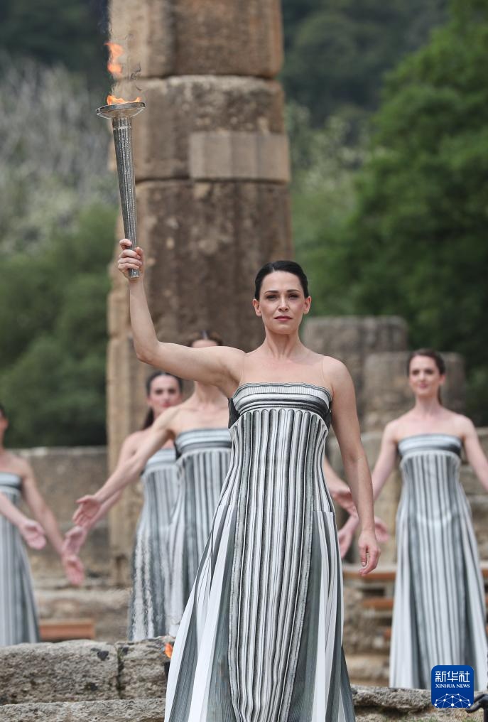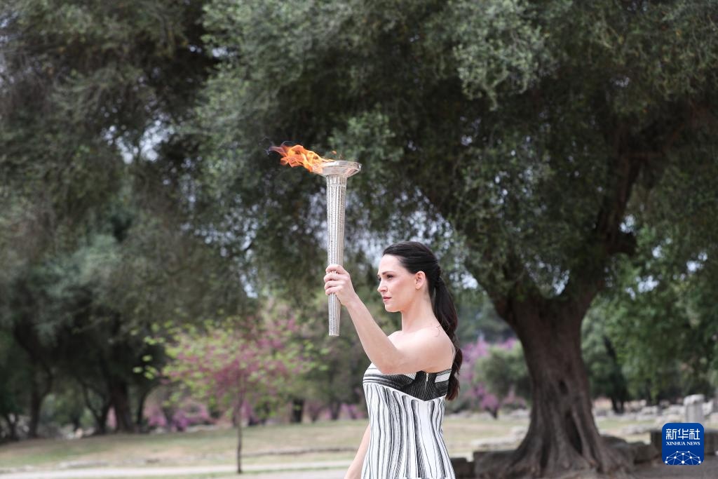 4月16日,扮演最高女祭司的演員瑪麗·米娜取得圣火。新華社記者 李京 攝