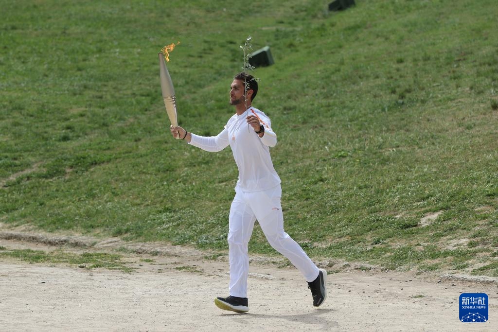 4月16日,第一棒火炬手——希臘運(yùn)動(dòng)員、東京奧運(yùn)會(huì)男子賽艇項(xiàng)目金牌得主斯特凡諾斯·恩圖斯科斯手持火炬進(jìn)行傳遞。新華社記者 趙丁喆 攝
