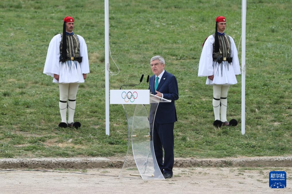 4月16日,國(guó)際奧委會(huì)主席巴赫在儀式上致辭。新華社記者 趙丁喆 攝