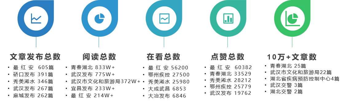 從單項指數看,文章發布總數、閱讀總數、點贊總數等指數波動明顯。在TOP100榜單中,超五成賬號文章發布總數上升,“最紅安”文章總增量為132篇,促使文章總數高達605篇,穩居單項指數首位。綜合來看,發文超200篇的賬號有14個,分別為“最紅安”“硚口發布”“秀美浠水”“武漢發布”“麻城發布”“荊州發布”“大成武昌”“微竹溪”“湖北福彩”“今點黃州”“湖北省總工會”“黃石發布”“新江陵”“武穴發布”。