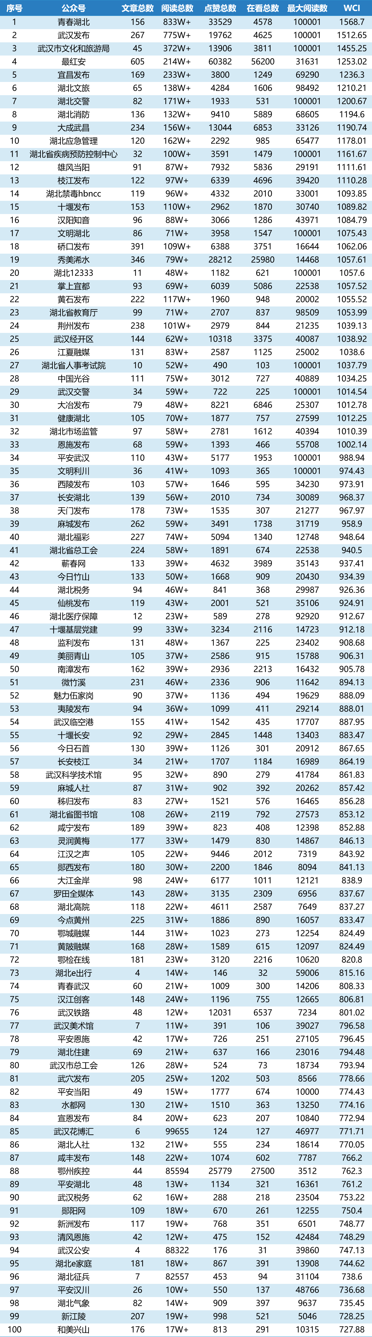 1、聚集湖北省內主要黨政機關政務微信公眾號,根據WCI指數數據進行科學排行,主要從“整體傳播力”“篇均傳播力”“頭條傳播力”“峰值傳播力”四個維度進行評價。