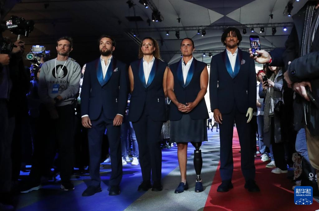 4月17日,法國運動員在慶祝活動上展示法國隊奧運會開幕式服裝。新華社記者 高靜 攝